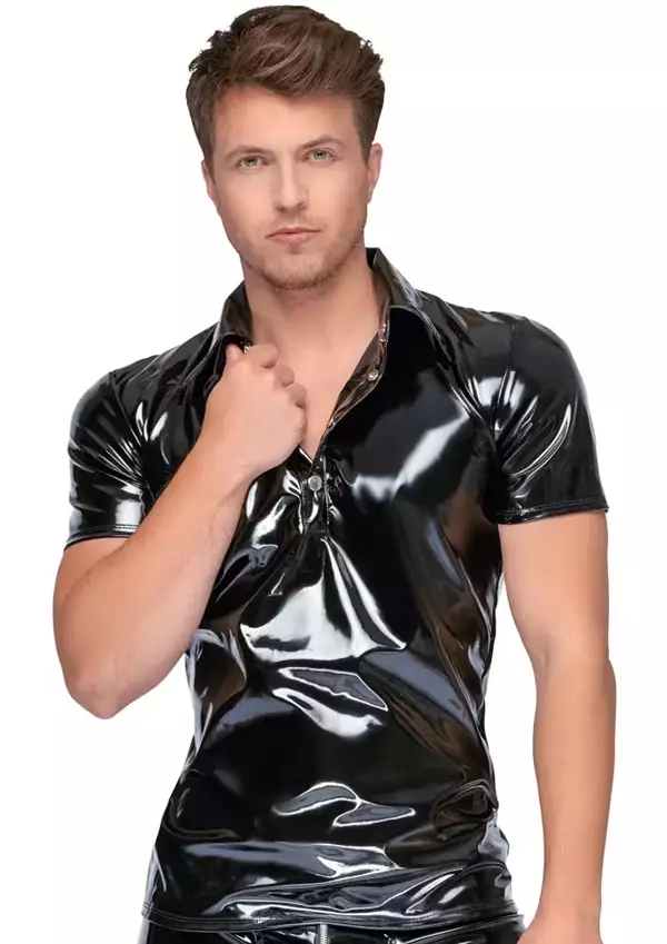 BlackLevel Miesten PVC Paita lyhyiilä hihoilla. Kaulukset ja edessä neljä painonappia. PVC pinnoitettu kangas kiiltää upeasti ja tuntuu mukavalta ihoa vasten. PVC asut on helppo pitää puhtaana. Pinnan voi pyyhkiä kostealla liinalla tai pese vaate käsin haaleassa vedessä miedolla pesuaineella. Ripusta kuivumaan, mutta vältä lämpöä tai auringon paistetta.