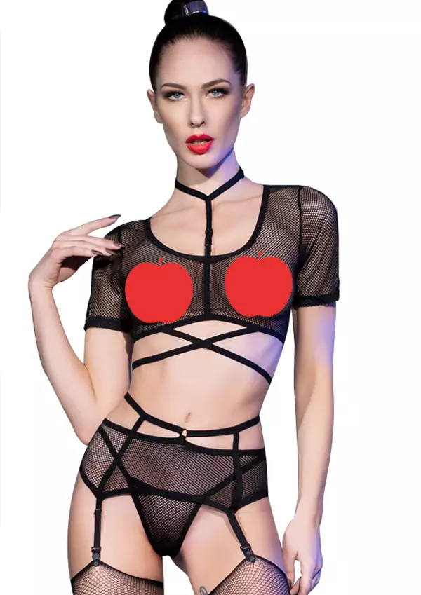 Chilirose Fishnet Alusasusetti suorastaan tihkuu seksiä. Se on juuri sopivasti läpinäyttävä. Pehmeää ja joustavaa materiaalia, ei hankalia hakasia. Settiin kuuluu toppi, sukkanauhaliivi, stringit sekä sukat. Peitä tarvittaessa nännit tasseleilla taikka rintaliiveillä ja käytä toppia vaikka yökerhossa.