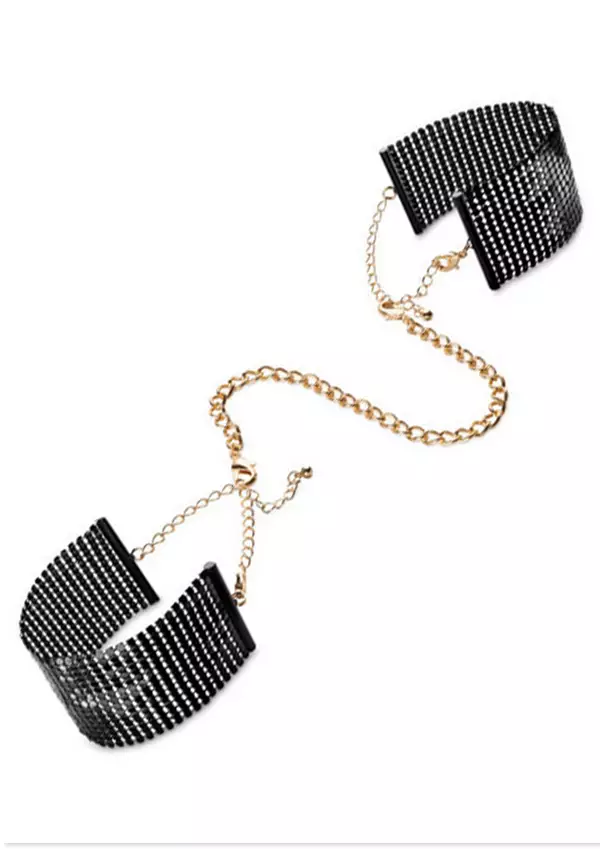 Desir Koru Käsiraudat ovat upeat ja voit käyttää niitä koruina vaikka aina. Mustaa metalliverkkoa ja kullanvärisillä ketjuilla. Rannekorun ympärysmitta on säädettävissä . Voit yhdistaa korut toisiinsaa mukana tulevalla ketjulla, jolloin sinulla on seksikkäät käsiraudat! Ihan kovinta menoa nämä tuskin kestävät.