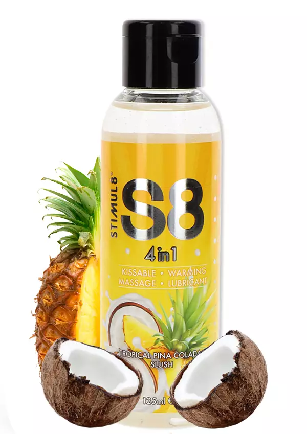 Dessert Stimul8 Pina Colada 4in1 hierontaöljy on myös liukuvoide! Herkullinen ananaksen ja kookoksen maku. Lisäksi se lämpenee ihanasti kehollasi. Tässä on siis neljä eri ominaisuutta! Turvallinen käyttää ja vaikka syödä. Valmistettu Saksassa. Pullo 125ml.