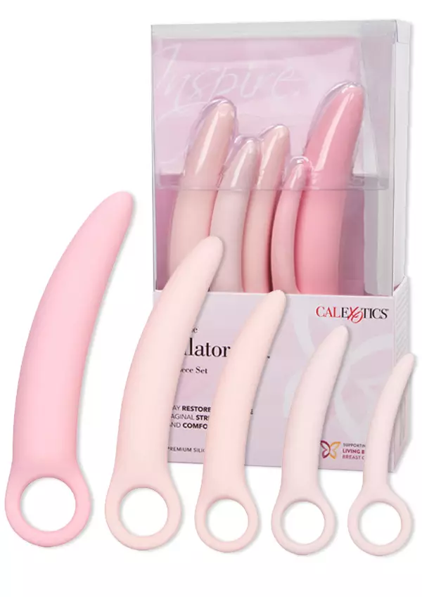 Silicone Dilator Kit pitää sisällääm viisi erikokoista dilaatio sauvaa. Dilaatio sauvat ovat tarkoitettu emättimen laajentamiseen mm. gynekologisten leikkausten jälkeen. Emättimen kireys voi johtua myös monesta muusta eri syystä tai pelkkä ajatus jonkin asian sisään työntymisestä kauhistuttaa. Dilaatio sauvoilla voit saada apua. Aloita pienimmällä ja siirry vähitellen isompaan. Jos haluat tarkkoja ohjeita, keskustele lääkärisi kanssa. Nämä dilaatio sauvat ovat valmistettu laadukkaasta, turvallisesta ja hygieenisestä silikonista. Pinta tuntuu ihanan samettiselta. Pienemmät suavat ovat hieman taipuisia. Sauvoissa kätevä lenkki, josta on hyvä pitää kiinni. Muista liukuvoide!!!