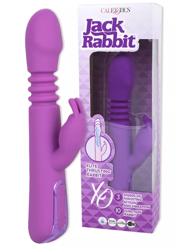Elite Thrusting Rabbit Pupuvibraattori työntyy sisääsi ja pupu viimeistelee nautinnon! Hieromasauvan pinta tuntuu ihanan samettiselta ja pupu taipuu muotojesi mukaan. Sauvan kärki tekee edestakaista liikettä kymmenellä eri rytmillä. Klitoriskiihotinpupu sykkii ja värisee myöskin kymmenellä eri rytmillä ja on todella tehokas! Käynnistä hierovasauva virtanapista. Sen alapuolelta saat pupun värisemään ja pohjassa olevasta napista saat pulsaattorin ohjelmia vaihdettua. Elite Thrusting Rabbit Pupuvibraattori on vesitiivis, joten voit leikkiä vaikka kylvyssä!