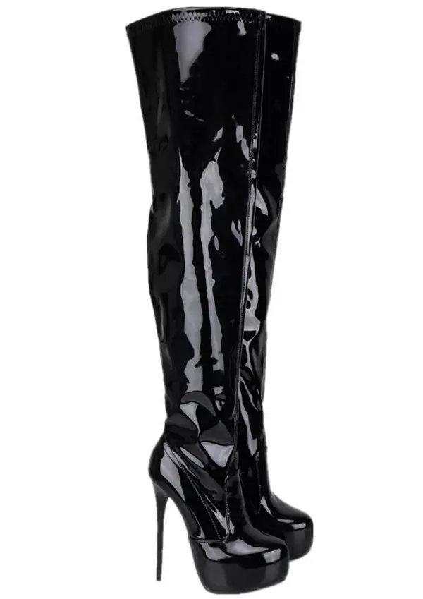 Erogance Platform Reisisaappaat kääntävät katseet! Korokepohja 4cm ja korko noin 15cm (6 tuumaa). Miellyttävän tuntuinen, pehmeä varsi istuu hyvin. Sivulla vetoketju. Materiaali kiiltopintainen keinonahka, tekstiili vuori.