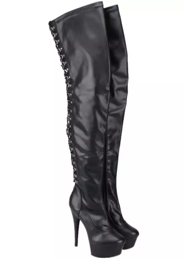 Erogance Platform Reisisaappaat kääntävät katseet! Korokepohja 4cm ja korko noin 15cm (6 tuumaa). Sivulla vetoketju. Takana kunnon nyöritys, jolla saat reisisaappaan varren juuri sopivaksi. Sivulla vetoketjut. Nyöritys kulkee metallisten lenkkien sisällä, joten sinun ei tarvitse joka kerta nyörittää saappaita. Materiaali mattapintainen keinonahka, tekstiili vuori.