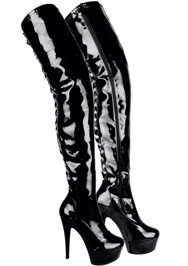Erogance Platform Reisisaappaat kääntävät katseet! Korokepohja 4cm ja korko noin 15cm (6 tuumaa). Sivulla vetoketju. Takana kunnon nyöritys, jolla saat reisisaappaan varren juuri sopivaksi. Sivulla vetoketjut. Nyöritys kulkee metallisten lenkkien sisällä, joten sinun ei tarvitse joka kerta nyörittää saappaita. Materiaali kiiltävä keinonahka, tekstiili vuori.