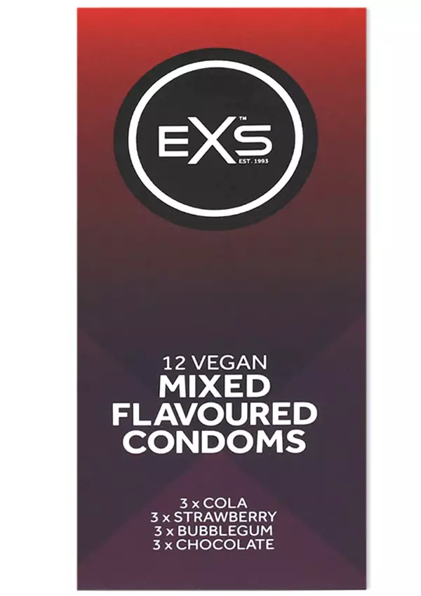 EXS Mixed Flavoured Kondomit saavat seksin maistumaan paremmalta. Neljä herkullista makua: cola, purukumi, mansikka ja suklaa. Ei voimakasta latexin tuoksua taikka makua. Kondomit ovat kärjestä hieman paksummaksi muotoiltuja, säiliöllä varustettuja sekä silikoniliukuvoiteella liukastettuja. EXS kondomit täyttävät tarkat ISO-turvallisuusstandardit.