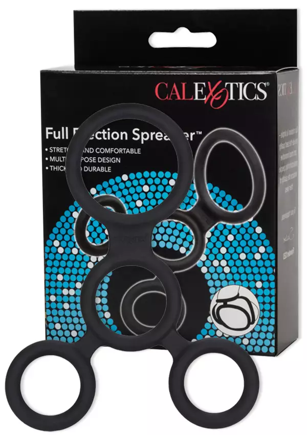 Full Erection Spreader Penisrengas on melko ohut ja joustava neljän renkaan kokonaisuus. Tee erektiostasi entistä kovempi ja kestävämpi. Yksi rengas peniksen tyveen, omat renkaat molempien kivesten ympärille ja yksi koko paketin taakse. Materiaali joustavaa ja laadukasta silikonia. Pese rengas aina ennen käyttöä sekä käytön jälkeen miedolla saippualla tai seksileluille tarkoitetulla pesuaineella. Aseta rengas paikoilleen liukuvoidetta apuna käyttäen.