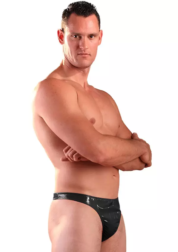 Joustavat, yhdenkoon tangat miehille. Seksikästä PVC pinnoitettua kangasta.