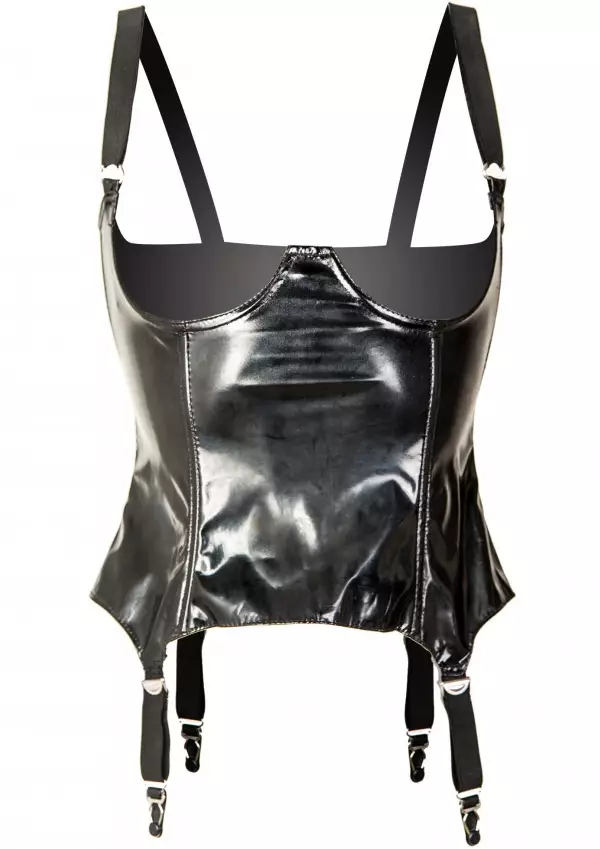 Seksikäs avokorseletti PVC pinnoitetusta kankaasta. Säädettävät olkaimet ja takana hakaskiinnitys. Neljä kiinteää sukkanauhaa. PVC pinnoitettu kangas kiiltää upeasti ja tuntuu mukavalta ihoa vasten. PVC asut on helppo pitää puhtaana. Pinnan voi pyyhkiä kostealla liinalla tai pese vaate käsin haaleassa vedessä miedolla pesuaineella. Ripusta kuivumaan, mutta vältä lämpöä tai auringon paistetta.