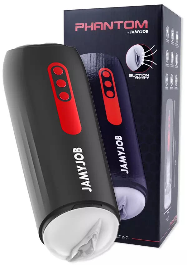 Jamyjob Phantom Masturbaattori tarjoaa automaattisen nautinnon. Tyylikäs puna/musta ulkomuoto yhdistettynä nautinnollisiin toimintoihin. Masturbaattorin sisus työntyy ulos viidellä eri rytmillä ja lisäksi se imee myöskin viidellä eri rytmillä. Helpot ja selkeät napit toimintojen ohjaamiseen ja voit käyttää toimintoja joko yhdessä taikka erikseen. Sisus on pehmeää ja sisältä nystyröityä silikonia. Se on myös helppo poistaa pesua varten. Varaa reilusti vesipohjaista liukuvoidetta, esim Be Happy ja valmistaudu nautintoon. Pidätkö hellävaraisista, tasaisista rytmeistä vai nopeammista ja intensiivisemmistä? Laite käynnistyy kun painat virtanappia ja jompaakumpaa toista nappia yhtäaikaa noin kolme sekuntia! Laite samuu samalla tavalla. Kun olet valmis, paina virtanappia kolmesti, jotta kelkka työntää siusksen ulos. Pese pehmeä sisus ja anna sen kuivua. Aseta takas paikoilleen ja paina jälleen virtanappia kolmesti, niin kelkka vetäytyy takas sisään ja saat kotelon kiinni. Jamyjob Phantom Masturbaattori on ladattava ja tarvittava USB latausjohto tulee tietenkin mukana.