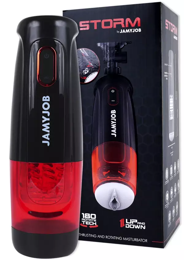 Jamyjob Storm Masturbaattori on jotain, mistä olet ehkä aina haaveillut! Automaattinen masturbaattori tarjoaa kymmen erilaista ohjelmaa ja imukupin avulla voit kiinnitää sen vaikka seinään. Sinun ei tarvitse tehdä mitään muuta kuin nauttia! Työnny mukavasti puristavasta tekopillusta läpi. Kotelon sisällä on sisältä pehmeä ja nystyröity kelkka, joka liikkuu edestakaisin ja lisäksi pyörii 360 astetta ympäri. Valitse sinulle sopiva ohjelma ja anna mennä! Kun olet valmis, käännä punainen osa auki ja poista kelkka masturbaattorin sisältä. Pese masturbaattori miedolla saippualla tai seksileluille tarkoitetulla pesuaineella. Masturbaattorin korkki aukeaa vetämällä, tai peukaloilla työntämällä. Suosittelemme avaaman sen, ennen kuin otat liukuvoidetta! Jamyjob Storm on ladattava ja tarvitta USB latuajohto tulee tietenkin mukana.