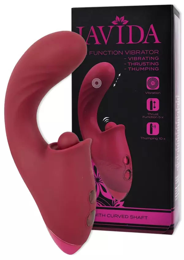 Javida 3 Function Vibraattori on hintansa arvoinen! Uskomattomat toiminnot, jotka eivät jätä ketään kylmäksi. Samalla kun klitoriskiihottimen pehmeä pallo koputtaa (jyskyttää) klitorista, koko vibraattori värisee. Saat siis sisäistä ja ulkoista nautintoa yhtäaikaa! Halutessasi voit käynnistää myös pienen työntöliikkeen, joka kaarevan muodon ansiosta stimuloi G-pistettä. Varsi on taipuisa ja se mukautuu kehosi mukaan antaen parhaimman nautinnon. Javida 3 Function Vibraattorin pinta on samettisen pehmeää silikonia. Selkeät ja hyvät napit toimintojen ohjaamiseen. Vibraattori on ladattava ja tarvittava USB latausjohto tulee teitenkin mukana. Suosittelemme!