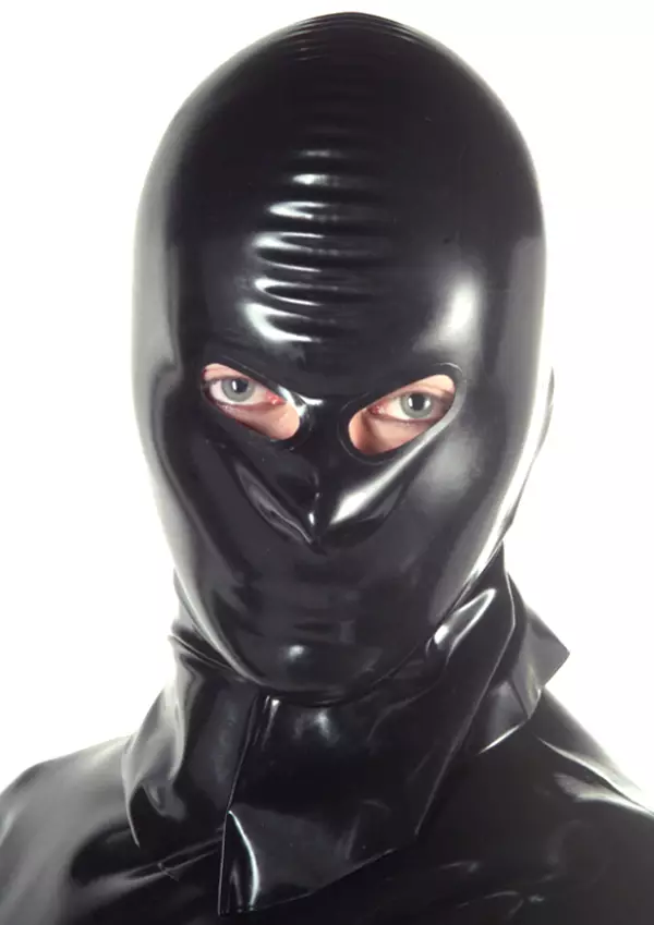 Lateksihuppu, jossa aukot silmien kohdalla ja vain pienet nenänreiät.