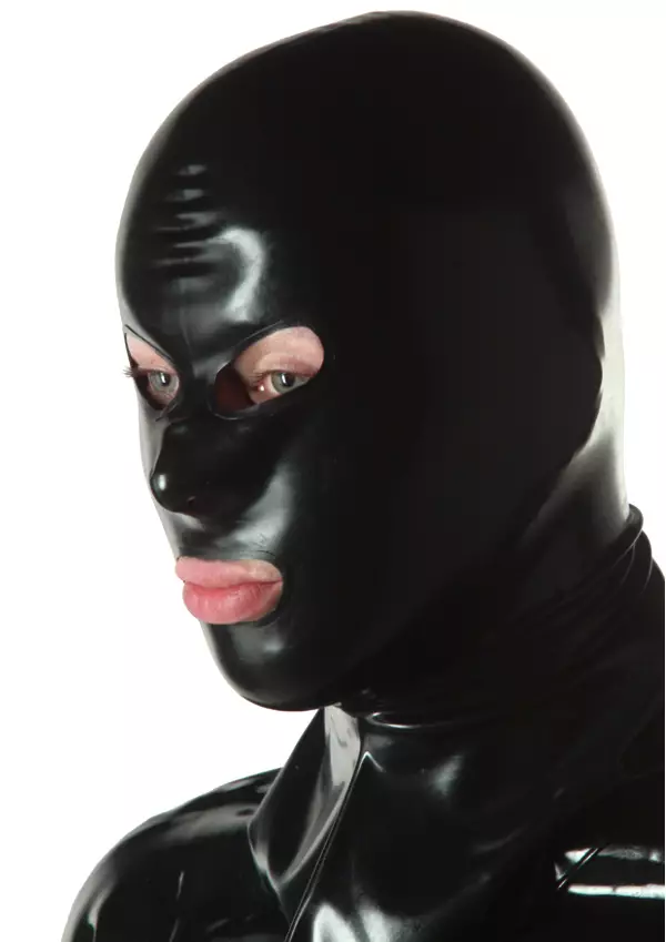 Latexa Hangman Kumihuppu, jossa kaulus laskeutuu hartioille. Aukot sekä silmien että suun kohdalla, myös pienet nenänreiät.