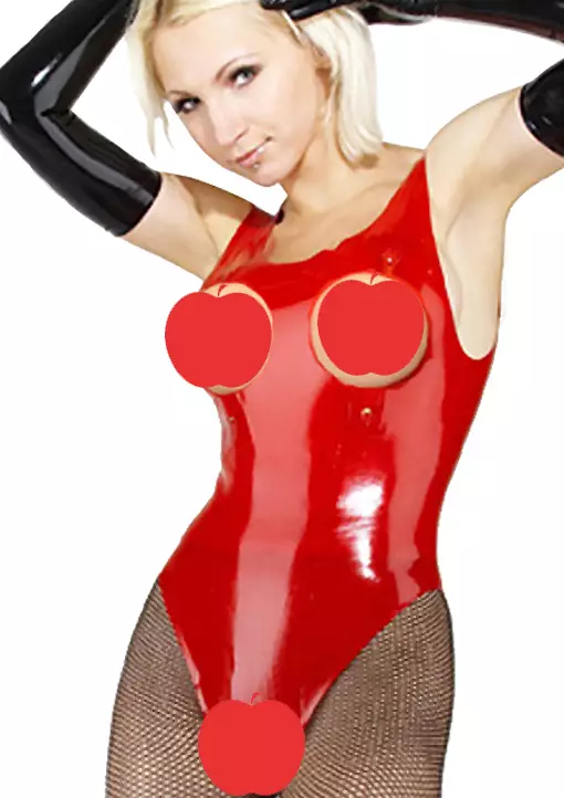 Latexa Punainen Kumibody, jossa avoimet rinnat ja haaroissa halkio. Tällä hurmaat kenet tahansa! Kuvassa myös pitkät käsineet 1108 sekä B07 verkkosukkahousut