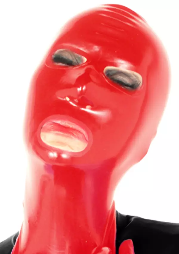 Latexa Punainen Kumihuppu, jossa vahvistetut aukot silmille ja suulle. Täydellinen huppu BDSM leikkeihin ja fantasioihin.