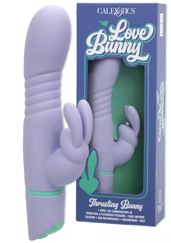 Love Bunny Thrusting Rabbit Vibraattori tarjoaa uskomatonta nautintoa! Näppärän kokoinen, silikonista valmistettu vibraattori syväilee sekä G-pistettä että klitorista yhtä aikaa. Hieman pulleampi kärki työntyy sisääsi hyväillen G-pistettä. Lisäksi pupun pehmeät korvat ja terhakka kuono värisevät tehokkaasti. Molemmissa toiminnoissa 12 eri vaihtoehtoa ja voit ohjata niitä erikseen. Love Bunny Thrusting Rabbit Vibraattorin pohjassa on kaksi selkeää nappia. Paina virtakytkintä noin 3 sekuntia ja laite käynnistyy. Samasta napista saat säädettyä työntöliikettä. Alemmasta napista saat pupun värisemään. Love Bunny Thrusting Rabbit Vibraattori on ladattava ja täysin vesitiivis.