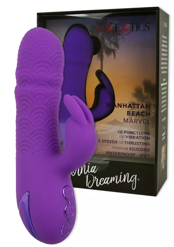 Manhattan Beach Marvel Vibraattori on varmasti uusi suosikkisi! Näppärän kokoinen ja kevyt vibraattori kätkee sisäänsä kaksi tehokasta moottoria, joita voit hallita erikseen. Pupu sykkii ja värisee kymmenellä eri rytmillä. Varsi tekee työntöliikettä kolmella eri nopeudella. Vibraattorin pita on laadukasta silikonia ja kivasti kuvioitu. Manhattan Beach Marvel vibraattorissa on matkalukko, joten se ei lähde vahingossa käyntiin. Avaa matkalukko painamalla ylintä nappia kolme sekuntia. Keskimmäistä nappia nopeasti painamalla saat pulsaattoria säädettyä. Alimmasta napista saat pupun ohjelmia vaihdettua. Mikäli haluat sammuttaa laitteen nopeasti, paina ylintä nappia. Kytke matkalukko päälle painamalla ylintänappia kolme sekuntia. Kuulostaa ehkä vaikealta, mutta on helppo käyttää! Vibraattori on vesitiivis ja voit leikkiä jopa kylvyssä! Manhattan Beach Marvel vibraattori on myöskin ladattava ja tarvittava USB latausjohto tulee tietenkin mukana. Muista vesipohjainen liukuvoide!