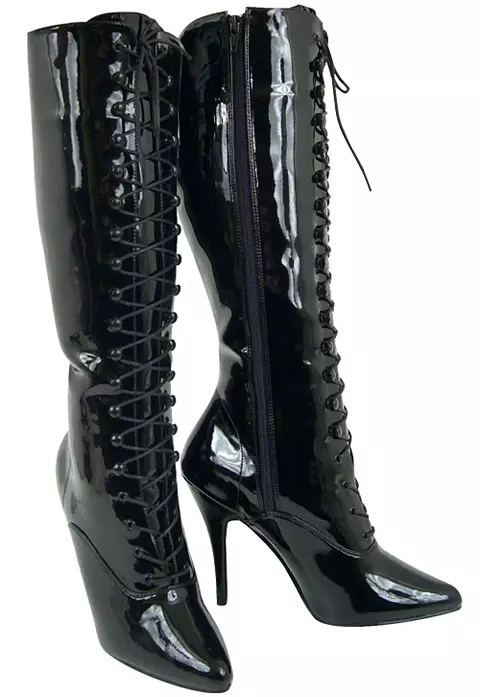 Aina tyylikkäät Pleaser polvisaappaat nyöreillä ja sivu-vetoketjulla. Nyöritystä ei tarvitse avata lainkaan jalkaan laitettaessa. Korko 12,5 cm.