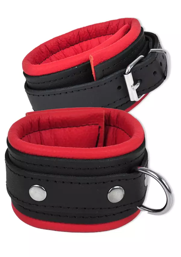 Kiotos sarjan nahkaiset nkäsikahleet. Sisäpuoli on pehmustettu punaisella, pehmeällä nahalla. D-renkaaseen voit kiinnittää ketjuja tai mukana tulevan karbiinihaan. Sarjassa myös yhteensopivat nilkkakahleet sekä kaulapanta.