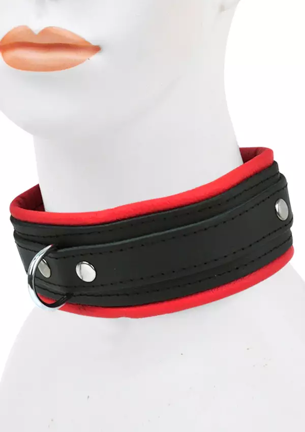 Kiotos sarjan nahkainen kaulapanta. Sisäpuoli on pehmustettu punaisella, pehmeällä nahalla. D-renkaaseen voit kiinnittää ketjuja tai vaikka talutushihnan. Sarjassa myös yhteensopivat käsikahleet sekä nilkkakahleet.