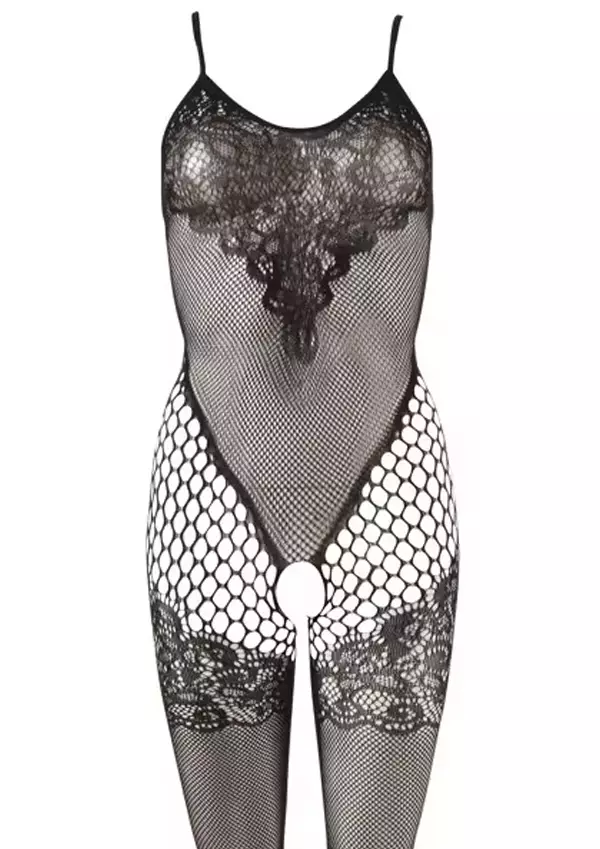 Upeasti koristeltu kissapuku, jossa joustavat olkaimet. Haaroista avoin. Yksi koko (S-L). Materiaali 90% polyamide, 10% elastane.