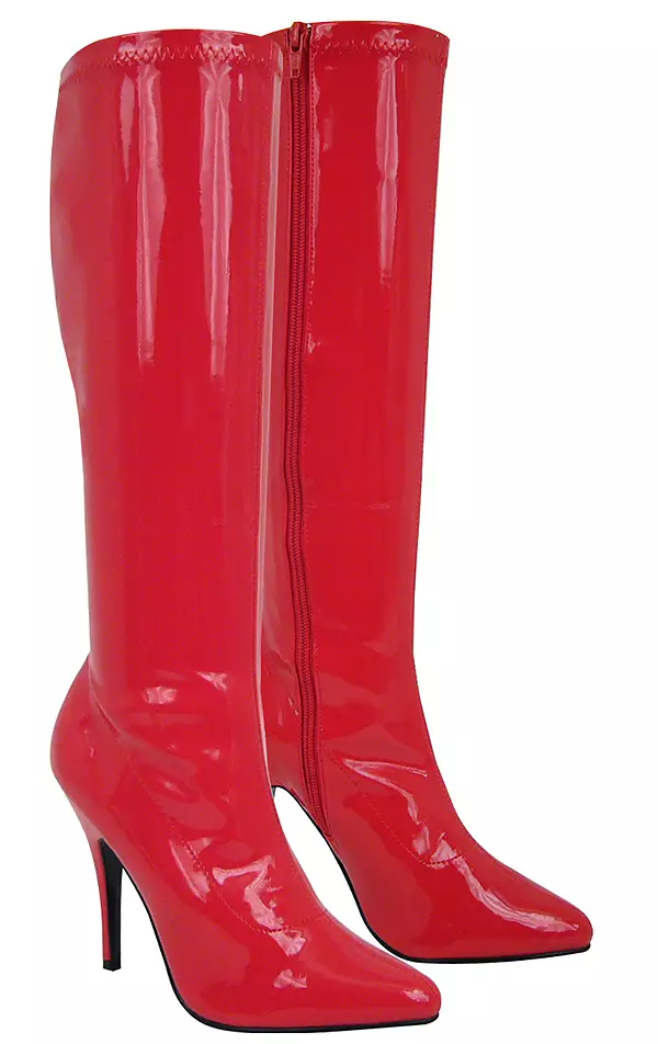 Punaiset, kiiltävät polvisaappaat, joissa sivulla vetoketju, Koot 38-46.