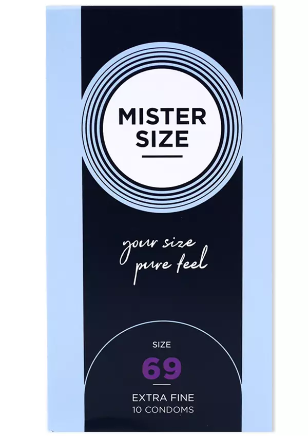 Pure Feel MisterSize 69 Kondomit. Käytät varmaankin mieluiten sopivaa paitaa taikka kenkiä, mikset siis myös täysin sopivaa kondomia. Oikean kokoinen kondomi puristaa juuri sopivasti eikä lörpötä. Mister Size on erittäin ohut, vain 0,06mm, joten ihan kuin olisit ilman. Kondomi on sileä, liukastettu ja säiliöllä varusettu.