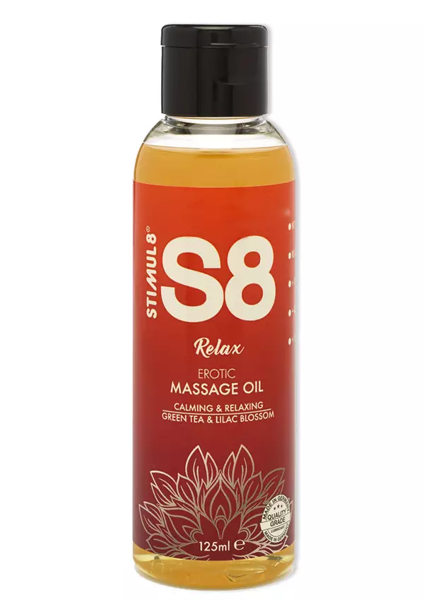 Relax Stimul8 Hierontaöljy eroottiseen hierontaan. Ainutlaatuinen sekoitus kolmea voimakasta öljyää. Ihoa rauhoittavaa ja vahvistavaa jojobaöljyä, kosteuttavaa manteliöljyä sekä hoitavaa seesamiöljyä. Stimul8 hierontaöljyyn on lisätty myös vitamiineja sekä mineraaleja. Hyvän ja eroottisen hieronnan jälkeen ihosi tuntuu ihanan silkkiseltä ja mielesi rennolt.