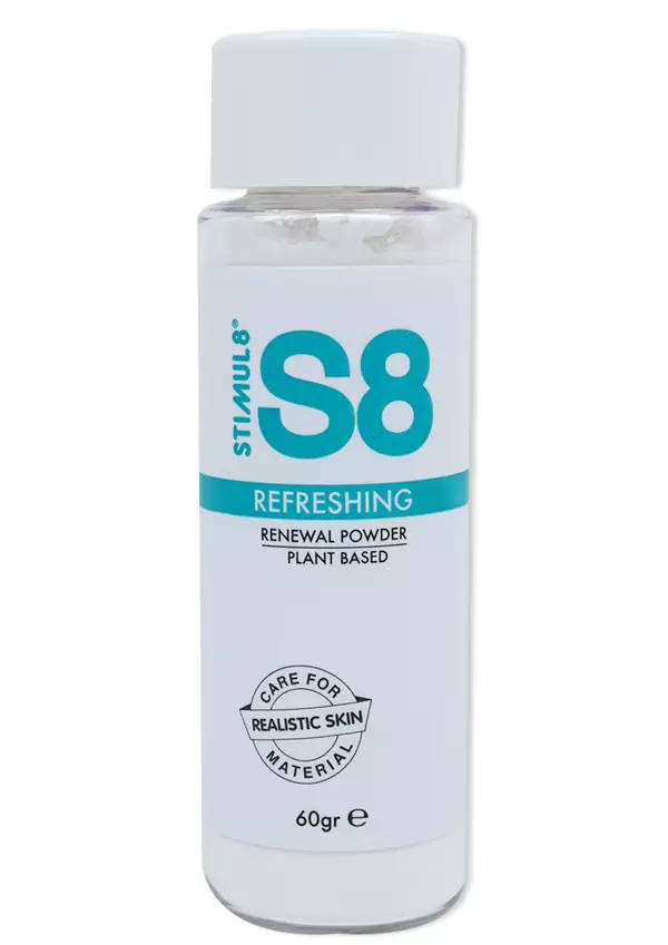 Renewal Powder Stimul8 Talkki on tarkoitettu aitoa ihoa muistuttavalle, pehmeille materiaaleille. Talkin avulla lelusi pysyy uudenveroisena pitkään! Hiero talkkia lelun pinnalle aina pesujen jälkeen. Hiero sitä varovasti, kunnes lelusi tuntuu taas pehmeältä ja sileältä. Pullossa 60g.