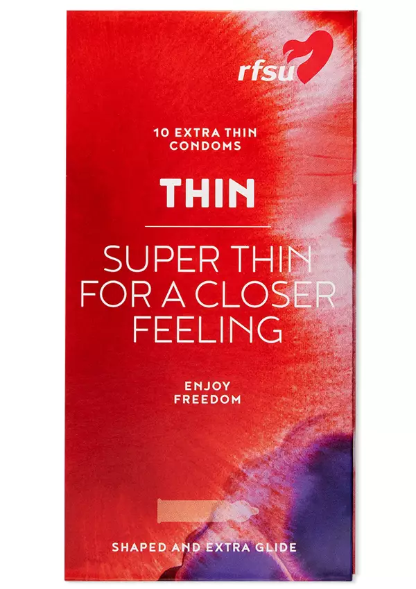 RFSU Thin on tavallista ohuempi kondomi, melkein kuin ilman. Kaikille, joiden mielestä kondomin pitää olla mahdollisimman huomaamaton, mutta silti luotettava. RFSU Thin on väritön, kostea ja muotoiltu sileäpintainen lateksikondomi. Leveys 53 mm.