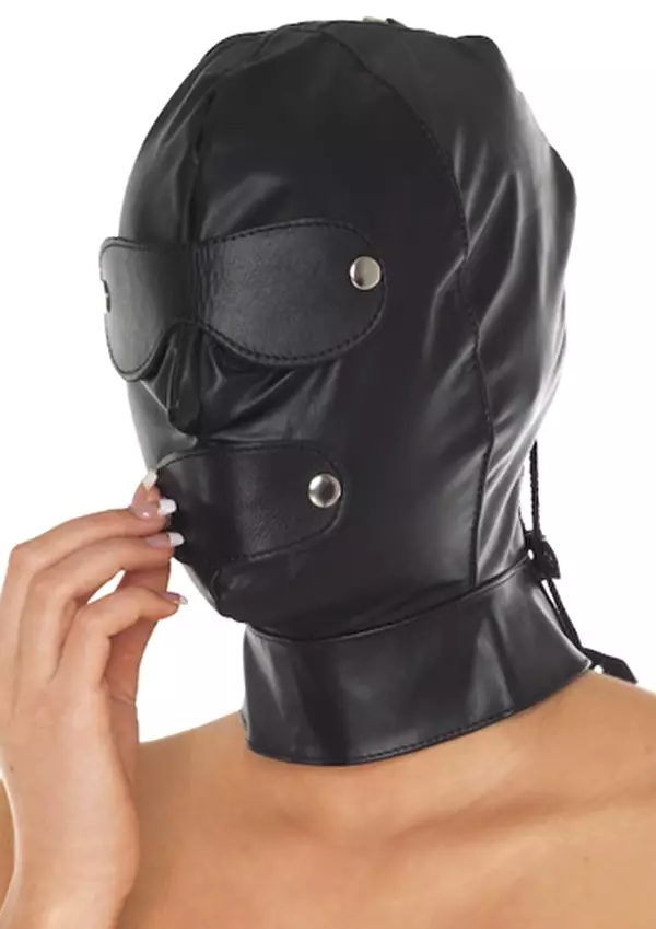 Laadukas huppu aidosta nahasta. Irroitettavat laput silmien ja suun kohdalla.