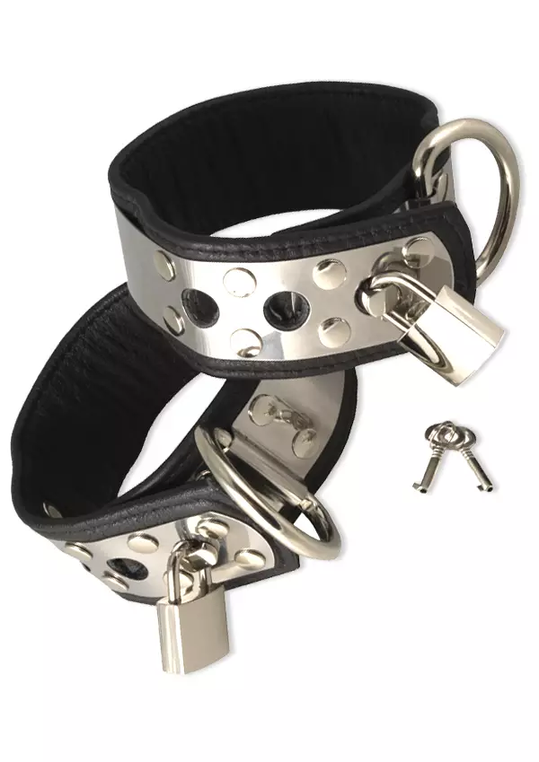 Nahkaiset, metallilla päällystetyt nilkkakahleet. Kiinnitetään lukolla. Mukana kahdet avaimet. Leveys 4,5cm.