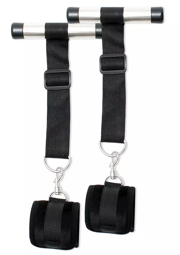 Ovikahleiden ansiosta kumppanisi ei pääse karkuun! Aseta kahleet oven yläreunaan ja sulje ovi. Pehmeät, samettiset käsikahleet sopivat useammille tarrakiinnityksen ansiosta ja voit käyttää niitä myös ilman ovikahleita. Käsikahleiden materiaali 100% polyester.