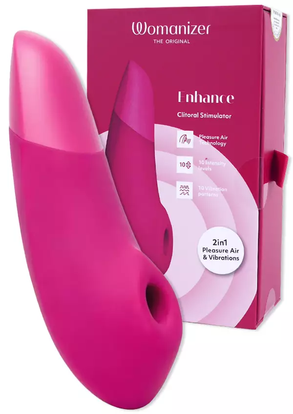Womanizer Enhance Paineaaltokiihotin tekee vaikutuksen ainutlaatuisella Pleasure Air -teknologialla ja ultratehokkaalla värähtelyllä. Pulsoivat paineaallot stimuloivat klitorista ilman kosketusta, samalla kun syvät, voimakkaat värinät leviävät koko vulvaan. Matalan taajuuden ansiosta värinä tuntuu todellakin luissa ja ytimissä olematta kuitenkaan liian voimakas. Lähes äänetön kaksoismoottori takaa, että voit keskityä vain nauttimiseen. Pulsoivia paineaaltoja ja värähtelyjä voidaan helposti ohjata napin painalluksella. Aaltoja ja värähtelyjä on 10 eri tilassa ja 10 intensiteetillä. Molempia toimintoja voidaan ohjata erikseen, ja ne voidaan siksi helposti yhdistää toisiinsa yksilöllisen nautinto-ohjelman luomiseksi, tarjolla on siis yli 1000 erilaista yhdistelmää! Womanizer Enhance on täysin vesitiivis ja voit nauttia suihkussa taikka kyvyssä. Muotoilunsa ansiosta se sopii täydellisesti intiimiin nautintoon, mutta se soveltuu loistavasti myös koko kehon nautintopisteiden tutkiskeluun. Womanizer Enhance Paineaaltokiihotin on ladattava ja tarvittava USB latuasjohto tulee tietenkin mukana.